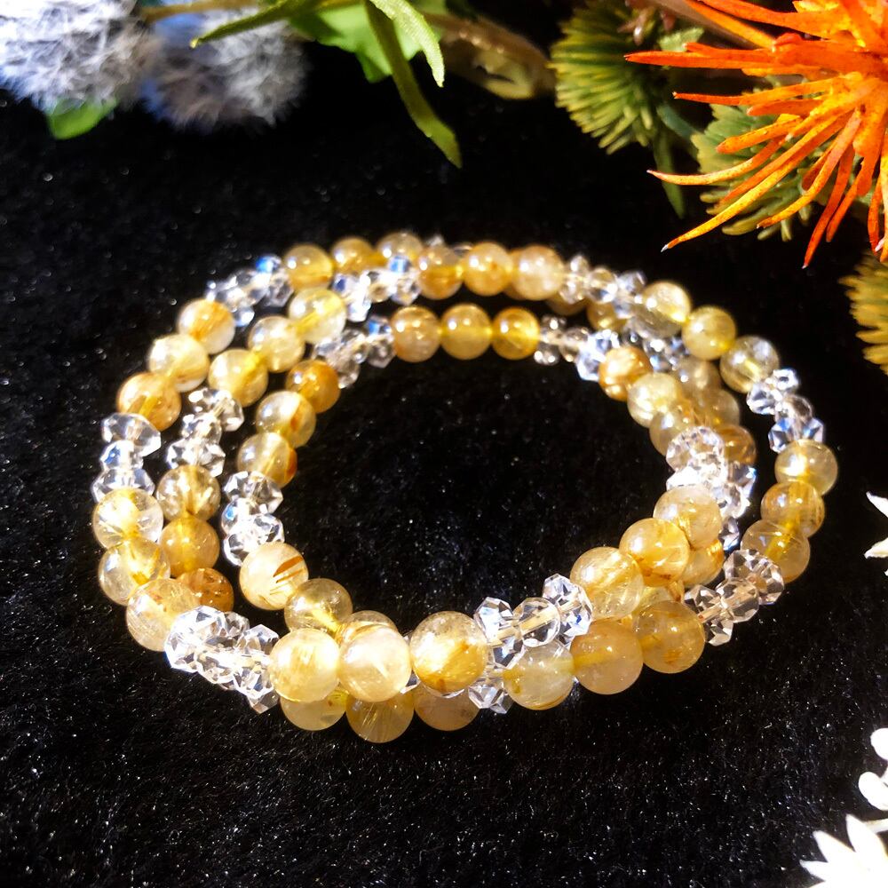 そんなゴールドルチルのブレスレットを、キラキラの水晶と合わせて、ラップブレスに仕上げました。