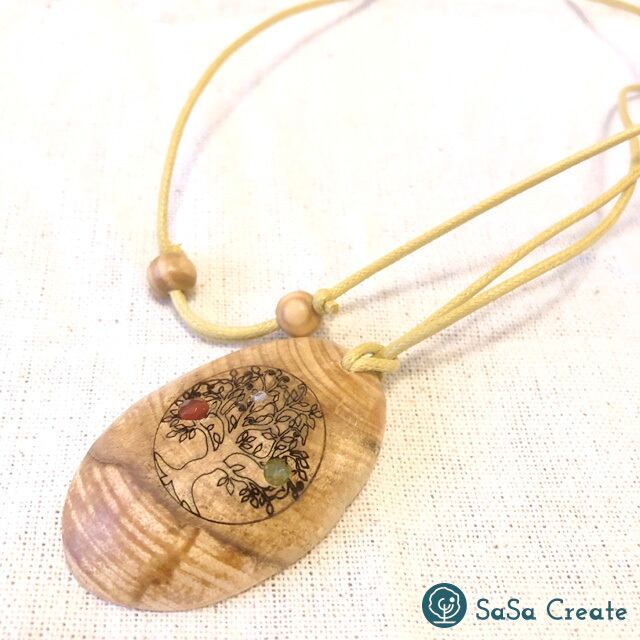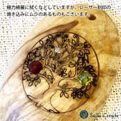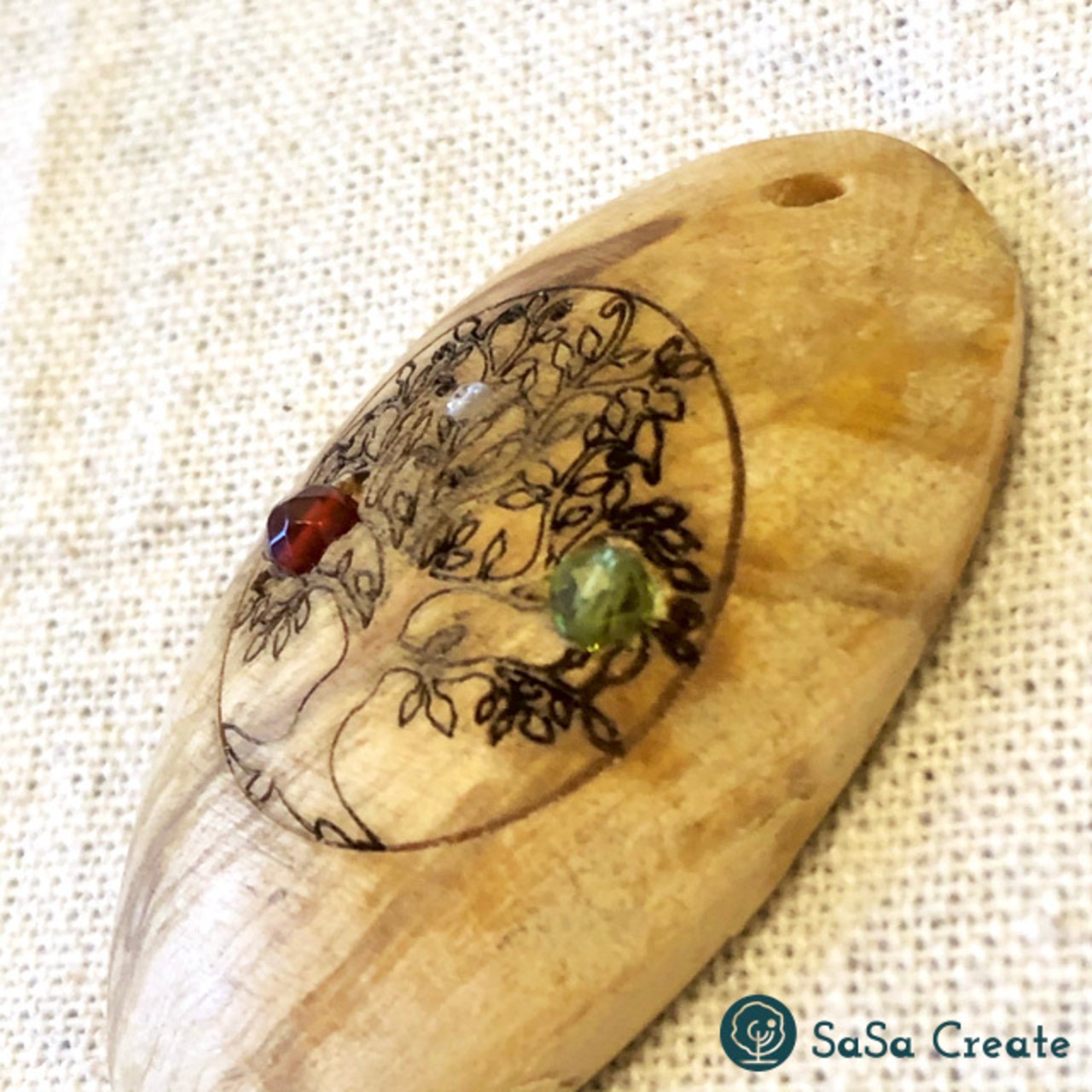 聖なる香木・パロサントに生命の樹(ツリーオブライフ)がレーザー刻印されたペンダントトップに、木の実のように天然石をはめ込んだペンダントです。